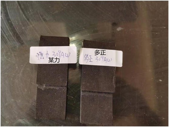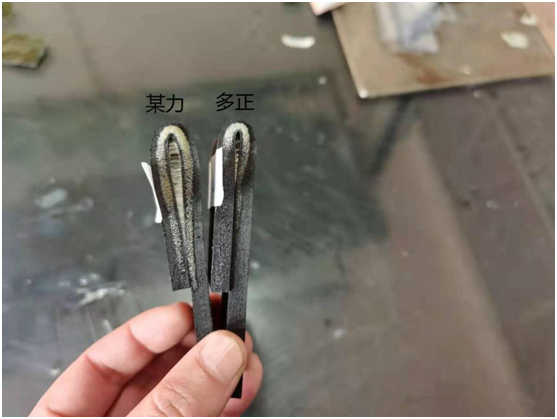 ※使用5mmPVC進(jìn)行耐高溫測(cè)試(60℃×30分鐘),某力的耐熱性稍有不足,材料粘結(jié)面拉絲空隙明顯;多正的耐熱性相對(duì)比較高,材料彈性緊密粘結(jié)。