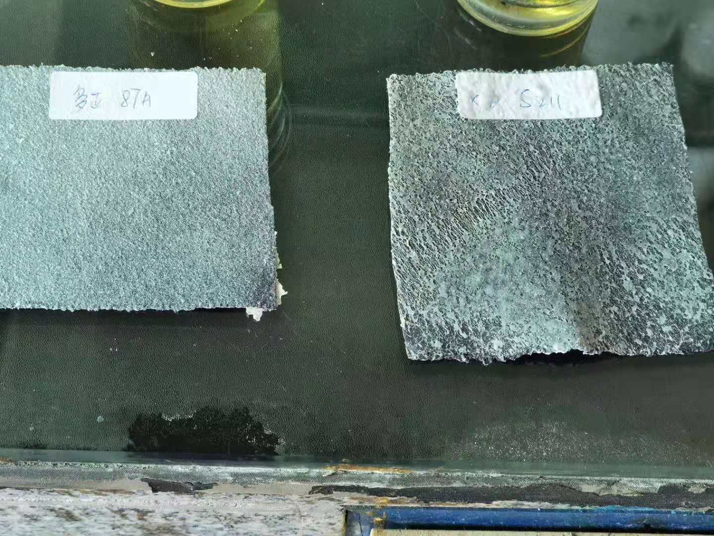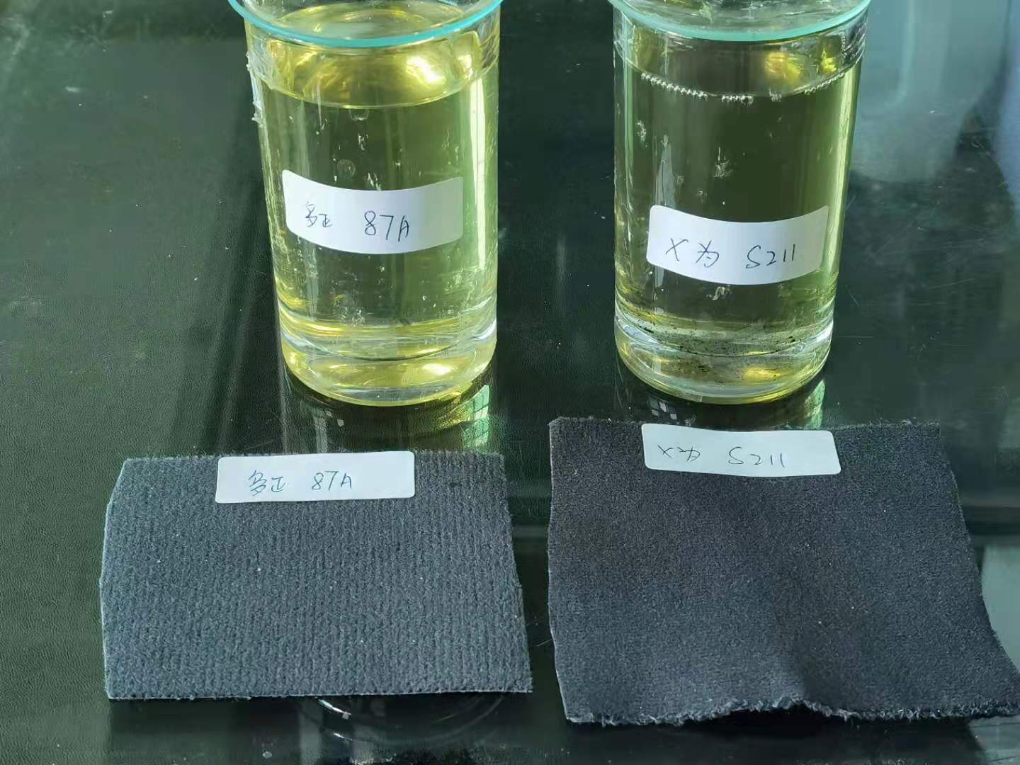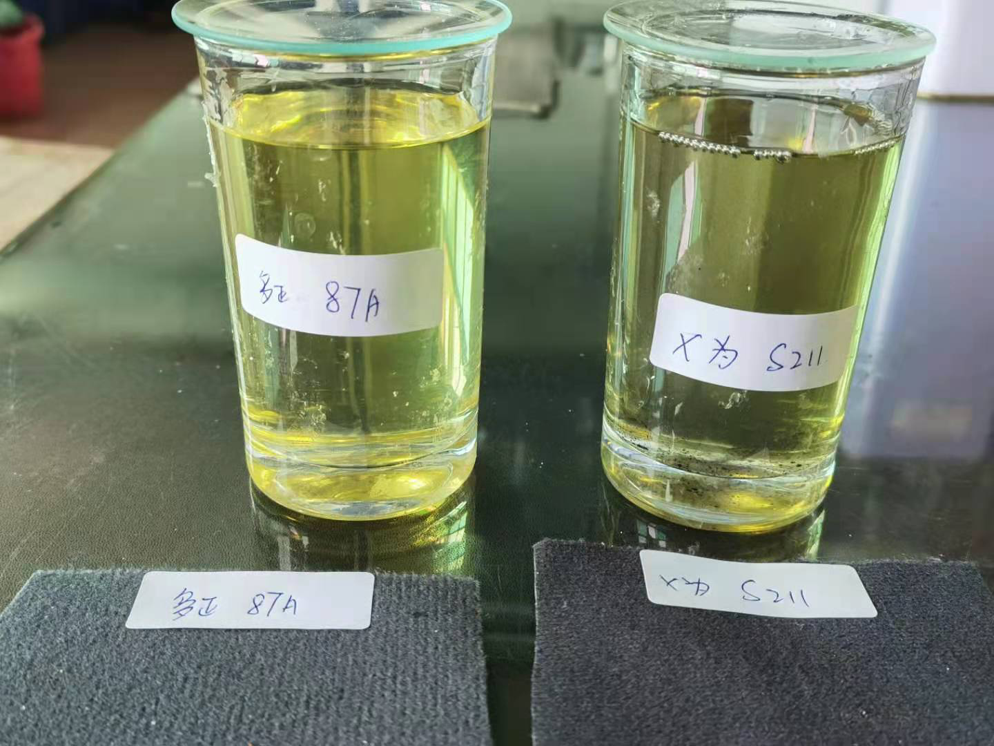 ※多正87A箱包噴膠呈現(xiàn)淺黃色透明狀,顏色清澈,粘稠度適中;某為S211箱包噴膠呈現(xiàn)黃色透明狀,粘稠度適中,相比多正87A,顏色稍深些。