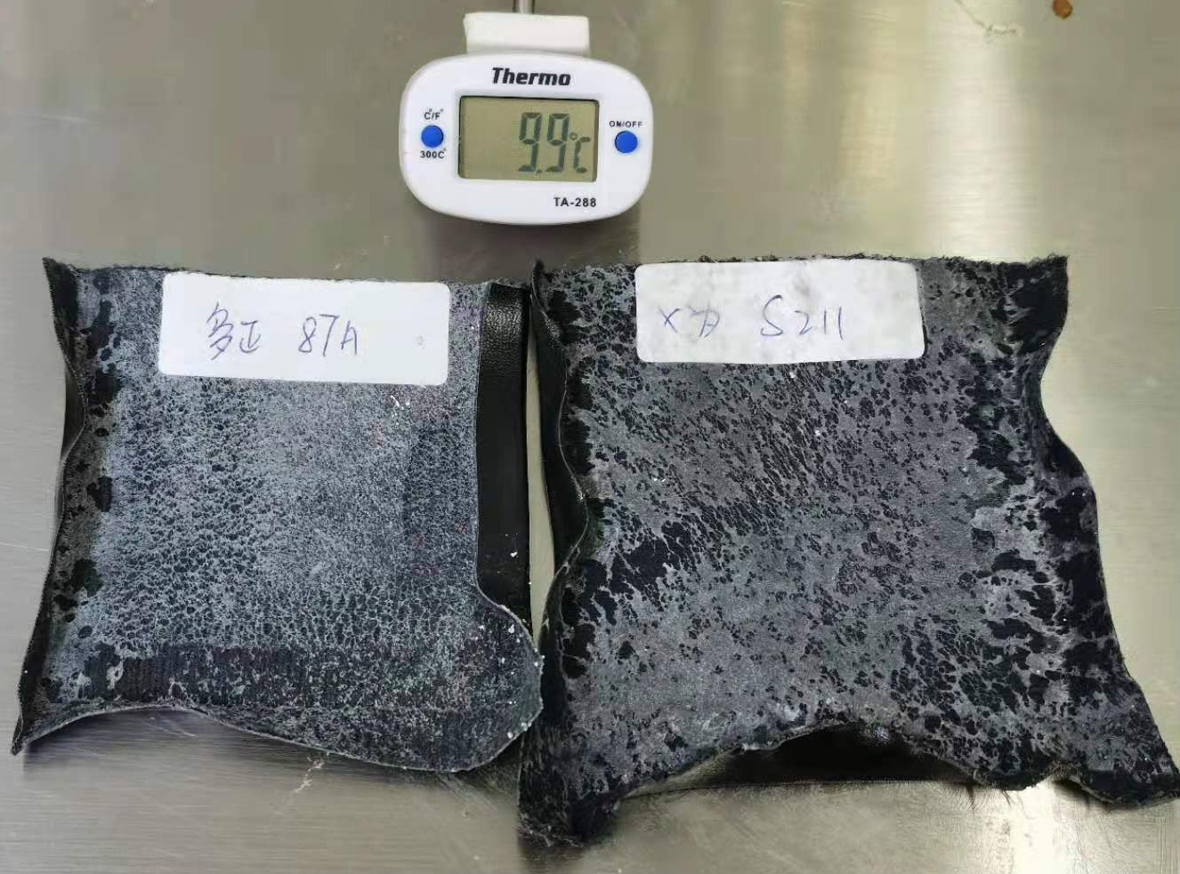 PU革毛面經(jīng)噴涂后在環(huán)境溫度10℃的粘接效果PK