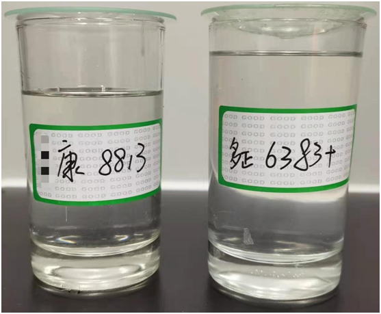 ※從玻璃杯里直觀可見,多正6383+和某康8813均為無(wú)色透明液態(tài)狀。