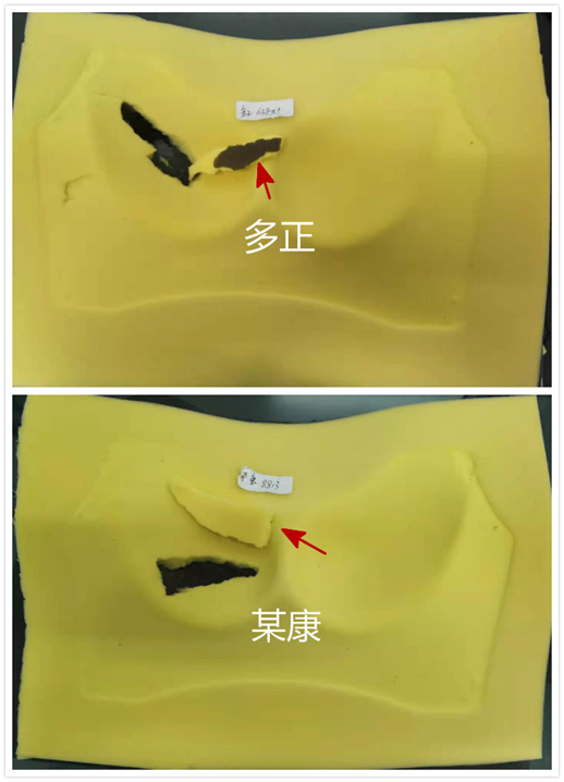 ※兩塊海綿材料被定壓成內(nèi)衣形狀后,分別通過(guò)力量撕扯海綿可見,多正6383+的內(nèi)衣膠粘結(jié)力比較好,海綿連帶著布料撕扯出來(lái),材料破壞程度較大;某康8813的內(nèi)衣膠粘結(jié)力稍弱,海綿與布料之間的粘性不大。