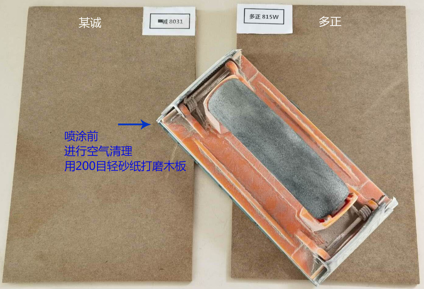 ※某誠8031噴涂時霧化自然,噴涂后木板表面稍有不平整;多正815W噴涂時流暢自然,均勻分布在木板表面,霧化效果非常好,有利于后期加工制作,保證產(chǎn)品的質(zhì)量穩(wěn)定性。