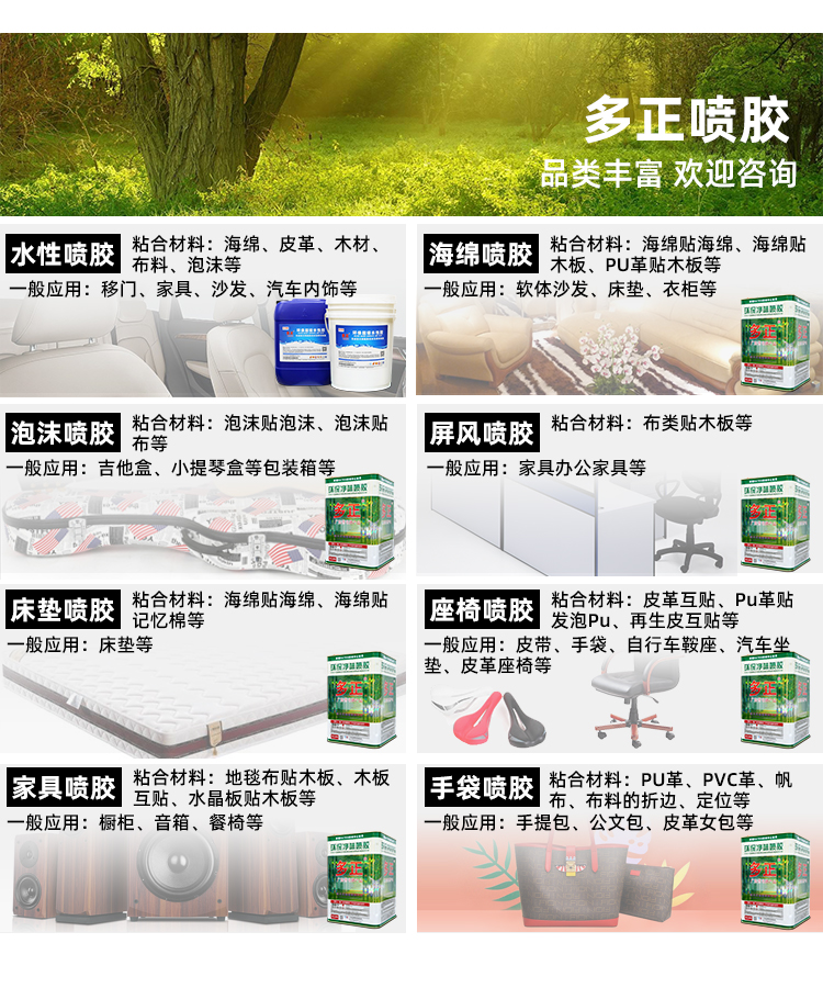 多正樹脂是專注于新型、環(huán)保膠粘劑研發(fā)、生產(chǎn)及銷售的國(guó)家高新技術(shù)企業(yè)。公司坐落于廣東省佛山市三水區(qū)蘆苞工業(yè)開發(fā)區(qū),占地8.8萬㎡,是國(guó)內(nèi)具當(dāng)先規(guī)模的膠粘劑生產(chǎn)基地。設(shè)有大型高分子化學(xué)研究所,擁全套進(jìn)口的精密生產(chǎn)線及檢驗(yàn)設(shè)備,年產(chǎn)能力10多萬噸。專業(yè)生產(chǎn)樹脂(膠粘劑)系列產(chǎn)品,有水性PU膠、水性噴膠、水性真空吸塑膠、包覆膠、噴膠、接枝膠、處理劑、生/粉膠、貼合膠、中底膠、固化劑、清潔劑等,共計(jì)100多個(gè)品種。產(chǎn)品可滿足所有鞋廠、鞋材廠、箱包手袋廠、沙發(fā)家具廠、貼合廠、門廠、汽車內(nèi)飾廠、門套線包覆廠、中底廠等廠家各種材料粘接的需要。