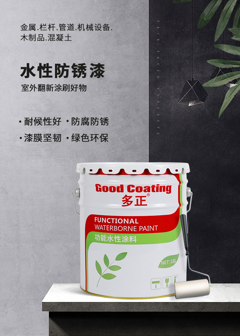 多正水性防銹漆是一種用水作為介質(zhì)的涂料,采取先進(jìn)配方結(jié)合滲透、封閉和穩(wěn)定的三合一工藝,通過活性顏料及防銹原材料在高分子無機(jī)材料的作用下,使活潑的鐵銹形成穩(wěn)定而致密的共聚化合物,使鐵銹鈍化失去活性,從而獲得附著力強(qiáng)的防銹保護(hù)層,防止水分子對基材的滲透;多正水性防銹漆是底面合一,均可輔助底漆、面漆使用,且具備優(yōu)良的填充性和增效節(jié)能降低成本優(yōu)勢,操作性強(qiáng)且環(huán)??煽?。